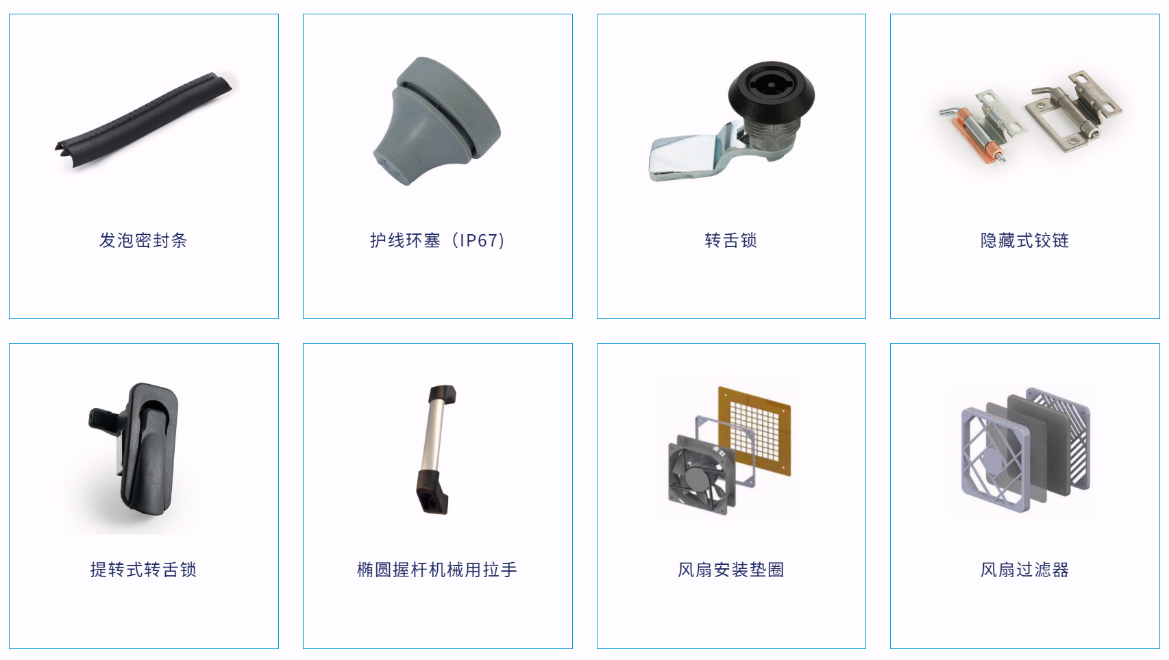 确保外箱、机柜和工业设备的安全性对于构建成功的应用环境而言至关重要。我们有多种零件可供选择,包括种类繁多的铰链和密封件,具有多种款式和材料,均按照I S O 、R o H S 和R e a c h 等最高行业标准制造。
